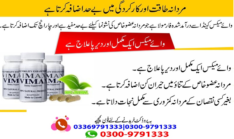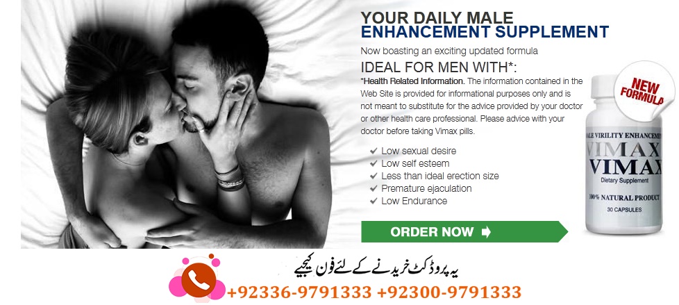 Vimax Pills Price in Pakistan Buy Online At Cheap Price. Candian Vimax Pills Will Helps You To Enhance Your Sexual Desire,Stamina And Power.Vimax Pills help you to enlarge your Penis size in length and thickness.Vimax Pills are 100 % natural and herbal, which means that there is no side effects and the results are 100 % sure.